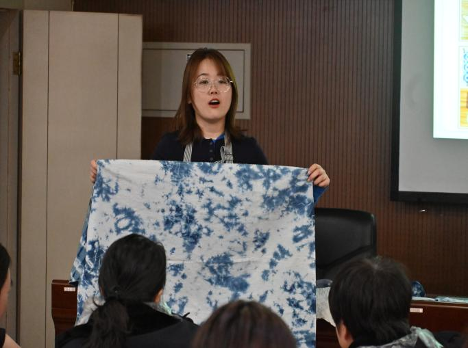 活动现场,我系师生发挥专业特色,将非遗扎染技艺与志愿服务深度融合,细致讲解扎染历史文化与制作技法,示范捆扎、染色、固色、晾晒等流程。