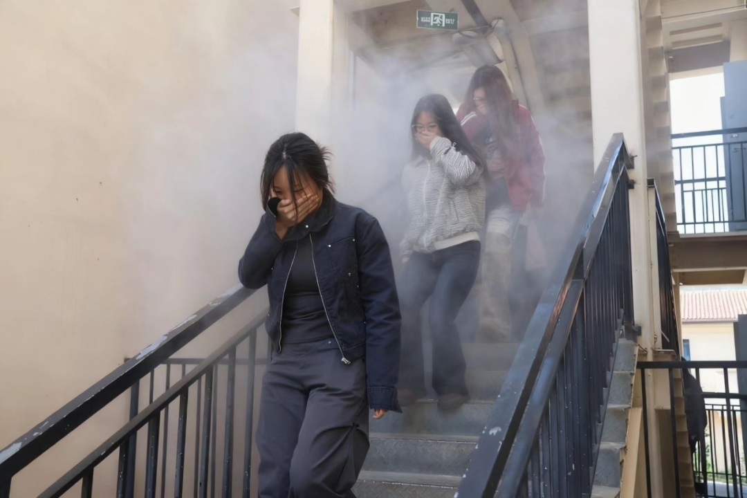 随着消防警报响起,演练启动。教学区任课教师有序引导学生撤离;宿舍区宿舍长召集同学沿预定路线转移,学生骨干在楼梯口、拐角处提醒“弯腰、捂鼻、快速前行”。全体师生动作迅速且有序,数分钟内全部撤离至指定集合点,各班班长清点人数后向辅导员报告,实现“人员无遗漏”。