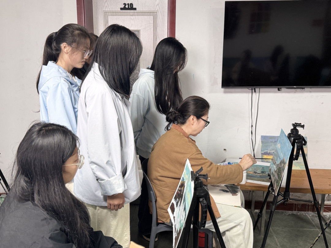 崂山依山傍海、云雾缭绕,山海相映,景致如画。写生期间,指导教师全程带队,从选景构图到色彩调和,从光影变化到情感表达,悉心示范、耐心指导。学生们在老师引领下深入自然,观察光色变化,体会笔触节奏,在实践中不断提升对艺术语言的理解与运用。白天,教师带领学生走进不同景点,现场讲解创作要点,帮助他们在真实的自然环境中锻炼观察与表达能力;夜晚,师生共同进行集中点评,教师逐一分析学生作品,从画面结构、笔法运用到整体气韵进行细致讲评,指导学生在思考与交流中不断进步。