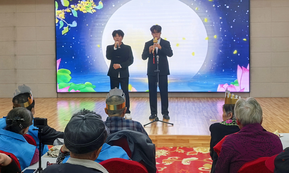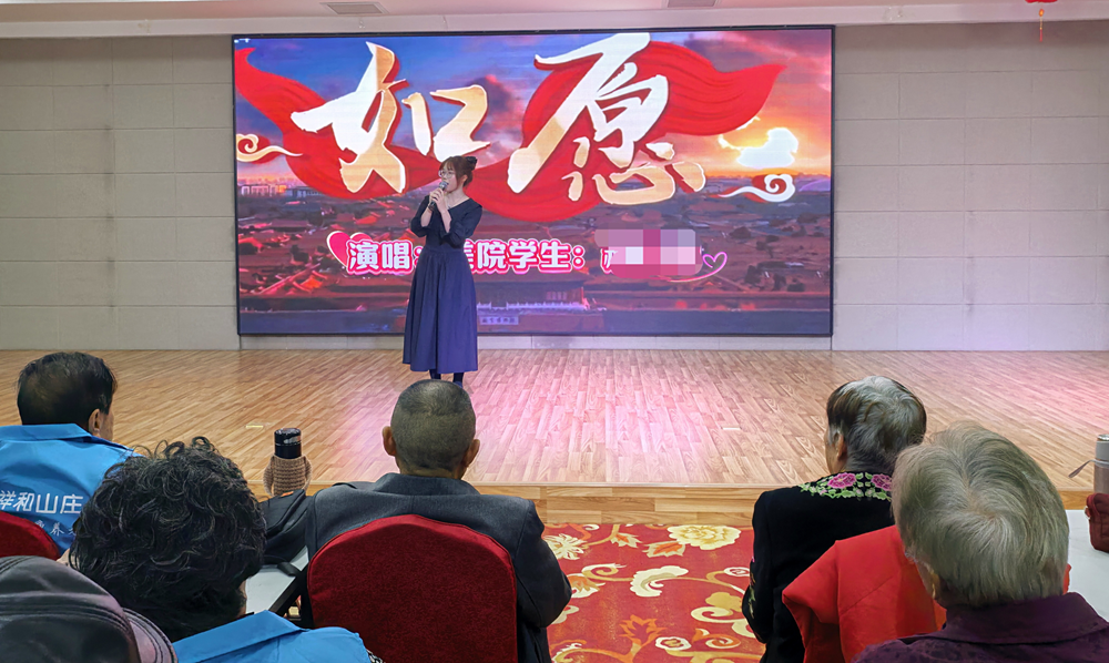 同学们精心准备了文艺节目,深情的歌声和悠扬的葫芦丝表演为老人们送上了节日的问候和祝福。